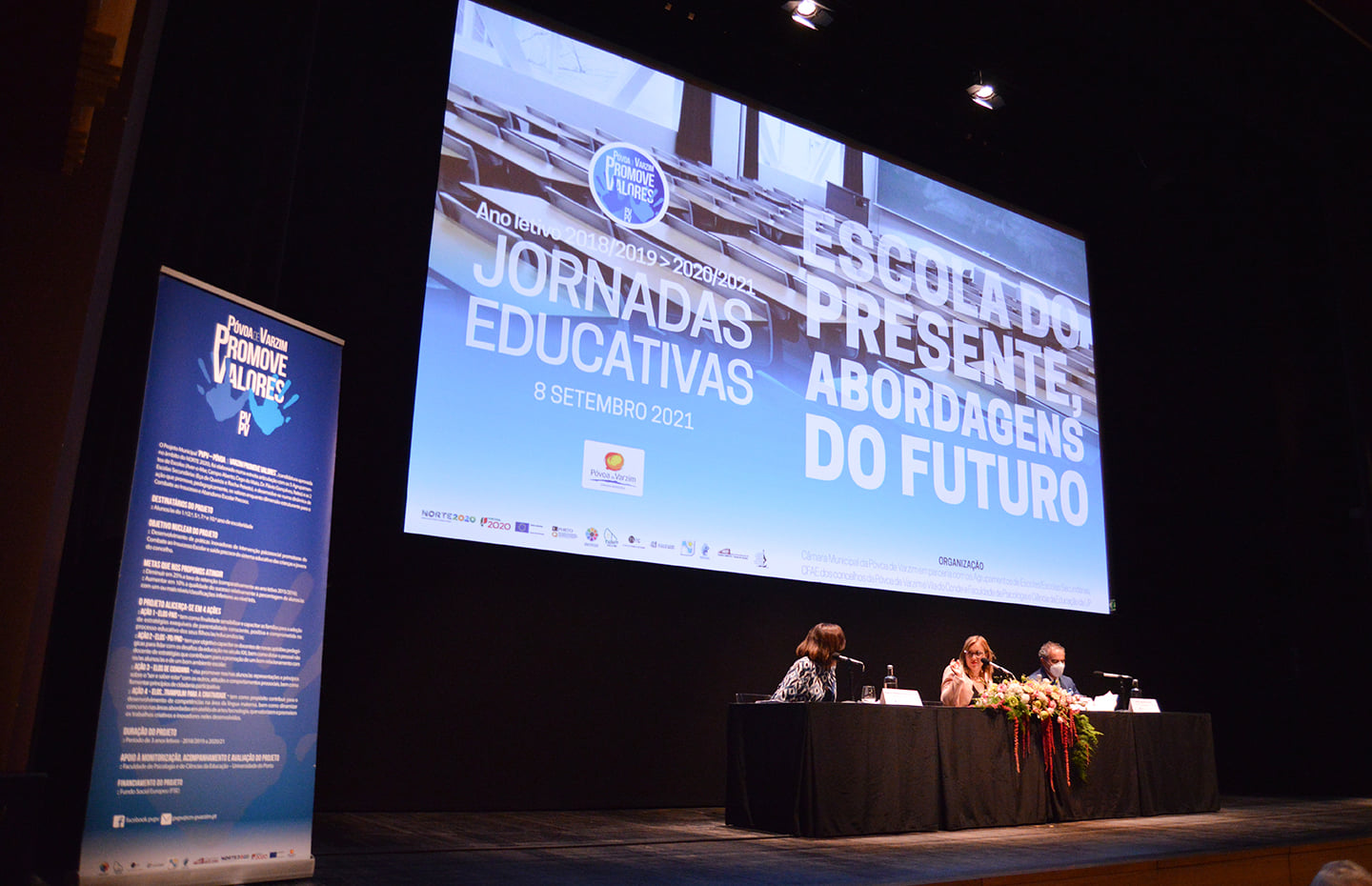 No âmbito do Projeto PVPV – Póvoa de Varzim Promove Valores e da Ação 2 – “Elos PD/PND” nele inscrita, o Município da Póvoa de Varzim em parceria com os Agrupamentos de Escolas/Escolas Secundárias, CFAE dos concelhos da Póvoa de Varzim e Vila do Conde e Faculdade de Psicologia e Ciências da Educação da Universidade do Porto, realizou no dia 8 de setembro, as JORNADAS EDUCATIVAS alusivas ao tema “ESCOLA DO PRESENTE, ABORDAGENS DO FUTURO”. Este evento contou com a presença de cerca de 150 participantes. A abertura das Jornadas Educativas contou com a presença do Senhor Vice-Presidente da Câmara Municipal da Póvoa de Varzim, Dr. Luís Diamantino, do Dr. Lino Ferreira, da Comissão Executiva da Área Metropolitana do Porto e do Dr. Luís Fernandes, Diretor do CFAE da Póvoa de Varzim e Vila do Conde.