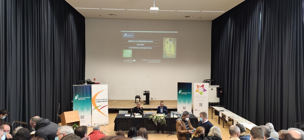 De seguida, o professor António Moreira apresentou aos presentes as linhas de força dos “Ambientes Híbridos de Aprendizagem”, tendo-se gerado um debate com a audiência acerca da implementação deste tipo de ambiente no contexto das nossas escolas.