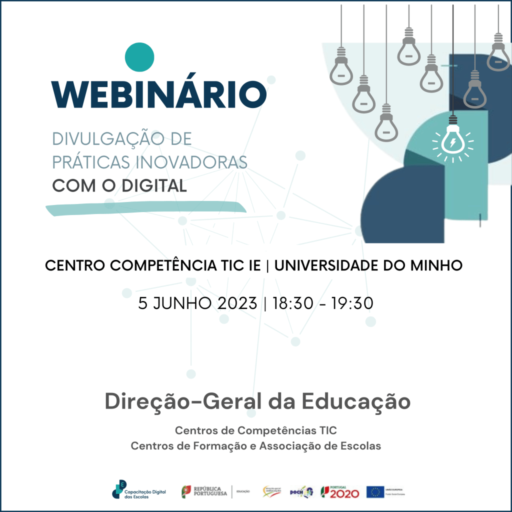 Encontra-se a decorrer um ciclo de webinários, com o objetivo de divulgar práticas inovadoras com o digital, elaboradas por diversos Agrupamentos de Escolas e ou Escolas não Agrupadas (AE/Ena), concebido no âmbito do Plano de Transição Digital.