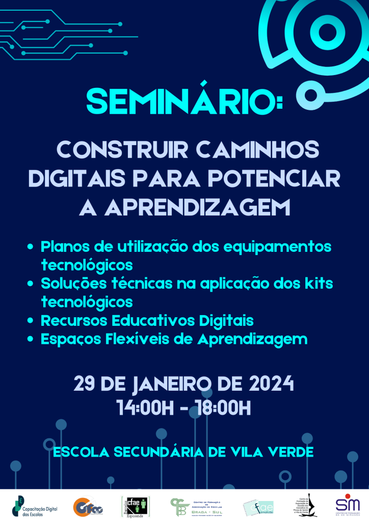 A Rede Minho de Embaixadores Digitais está a organizar um seminário presencial, que irá decorrer na Escola Secundária de Vila Verde, no dia 29 de janeiro de 2024, entre as 14h00 e as 18h00, subordinado ao tema Construir Caminhos Digitais para Potenciar a Aprendizagem (a certificar como ACD).