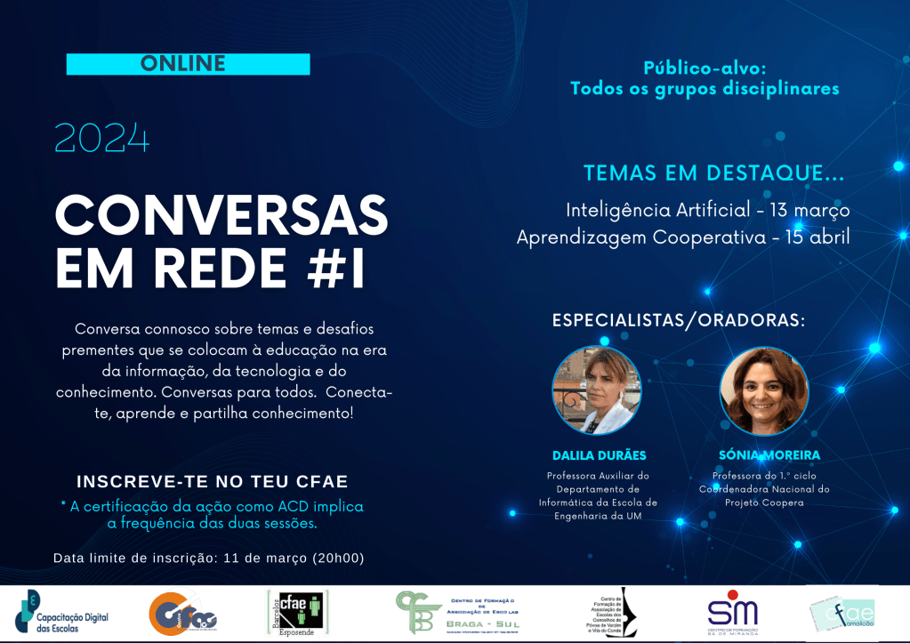 Em parceria com os CFAE de Barcelos e Esposende, Vila Nova de Famalicão, Braga Sul, Sá de Miranda e Alto Cávado, o CFAE – PVVC está a organizar um conjunto de quatro eventos online intitulado “Conversas em Rede” com o objetivo de discutir temas prementes da educação no século XXI no sentido da melhoria do ensino e da aprendizagem, rentabilizando o potencial das tecnologias digitais.